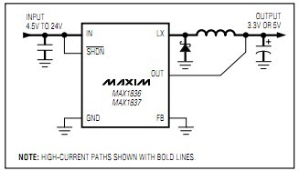 The MAX1837EUT50 high efficiency stepdown converter provides a preset 3.3V or 5V output voltage from supply voltages as high as 24V. Using external feedback resistors, the output voltage may be adjusted from 1.25V to VIN. An internal current-limited switching MOSFET delivers load currents up to 125 mA.