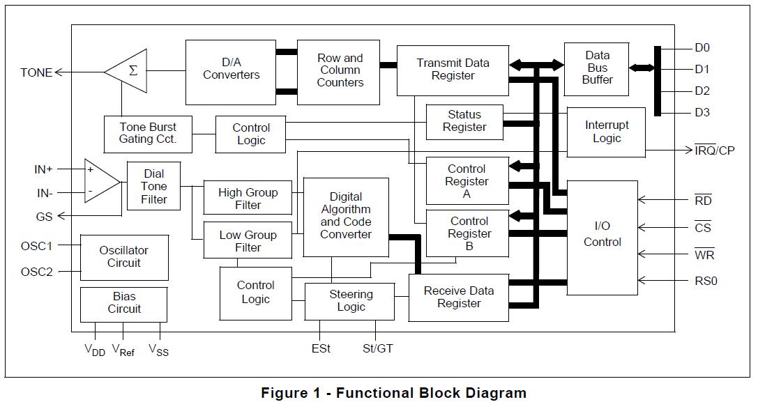 MT8888CS features: (1)Central office quality DTMF transmitter/receiver; (2)Low power consumption; (3)High speed Intel micro interface; (4)Adjustable guard time; (5)Automatic tone burst mode; (6)Call progress tone detection to -30 dBm.